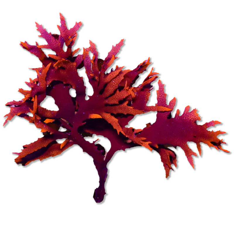 Dragon?s Tongue is a striking red macroalgae known for its fiery, ribbon-like fronds. It thrives in reef tanks, aiding in nutrient export by absorbing excess nitrates and phosphates. This slow-growing algae provides shelter for marine life while enhancing the aquarium?s visual appeal. It flourishes under moderate to high lighting with gentle water flow.