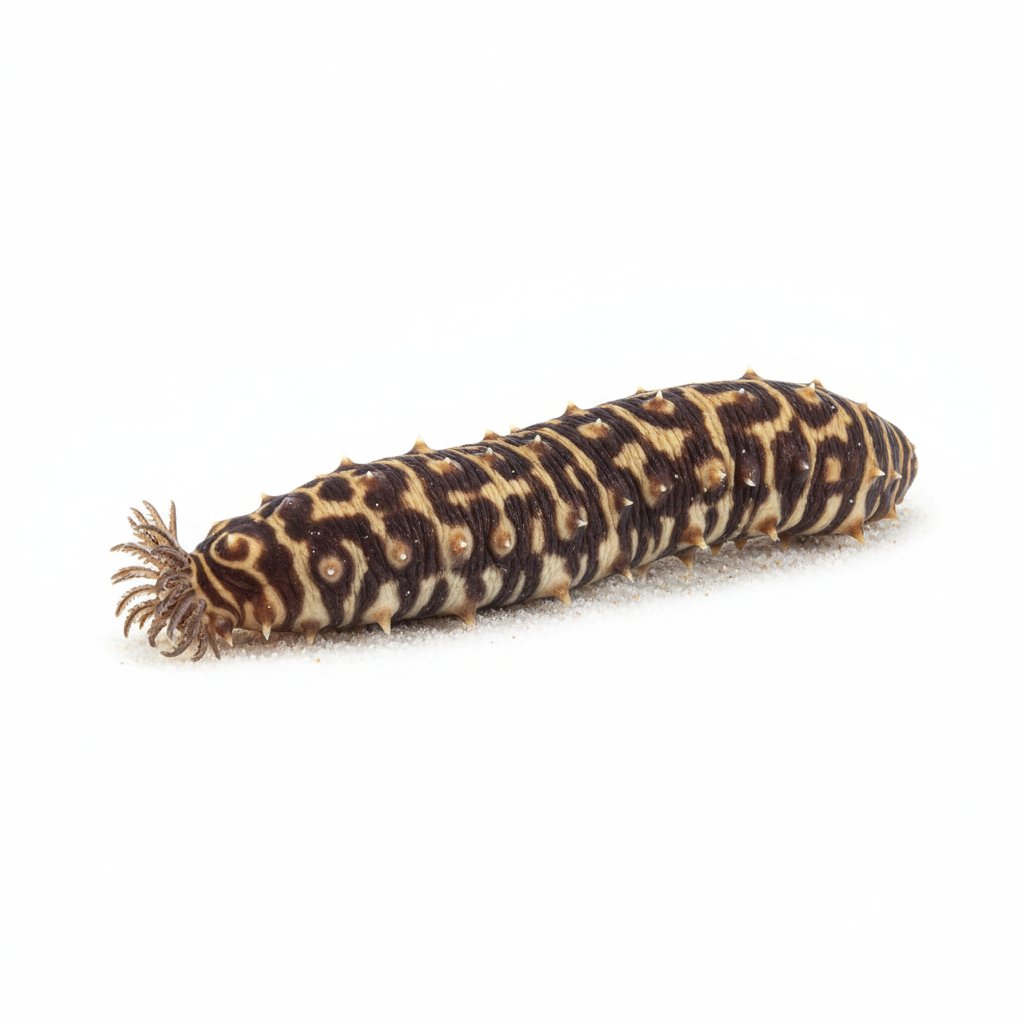 The Tiger Tail Cucumber is a long, cylindrical sea cucumber with a mottled brown and tan pattern resembling a tiger’s tail. It is a beneficial sand-sifting species that helps maintain a clean aquarium by consuming detritus and organic waste. This peaceful marine invertebrate thrives in well-established reef environments.