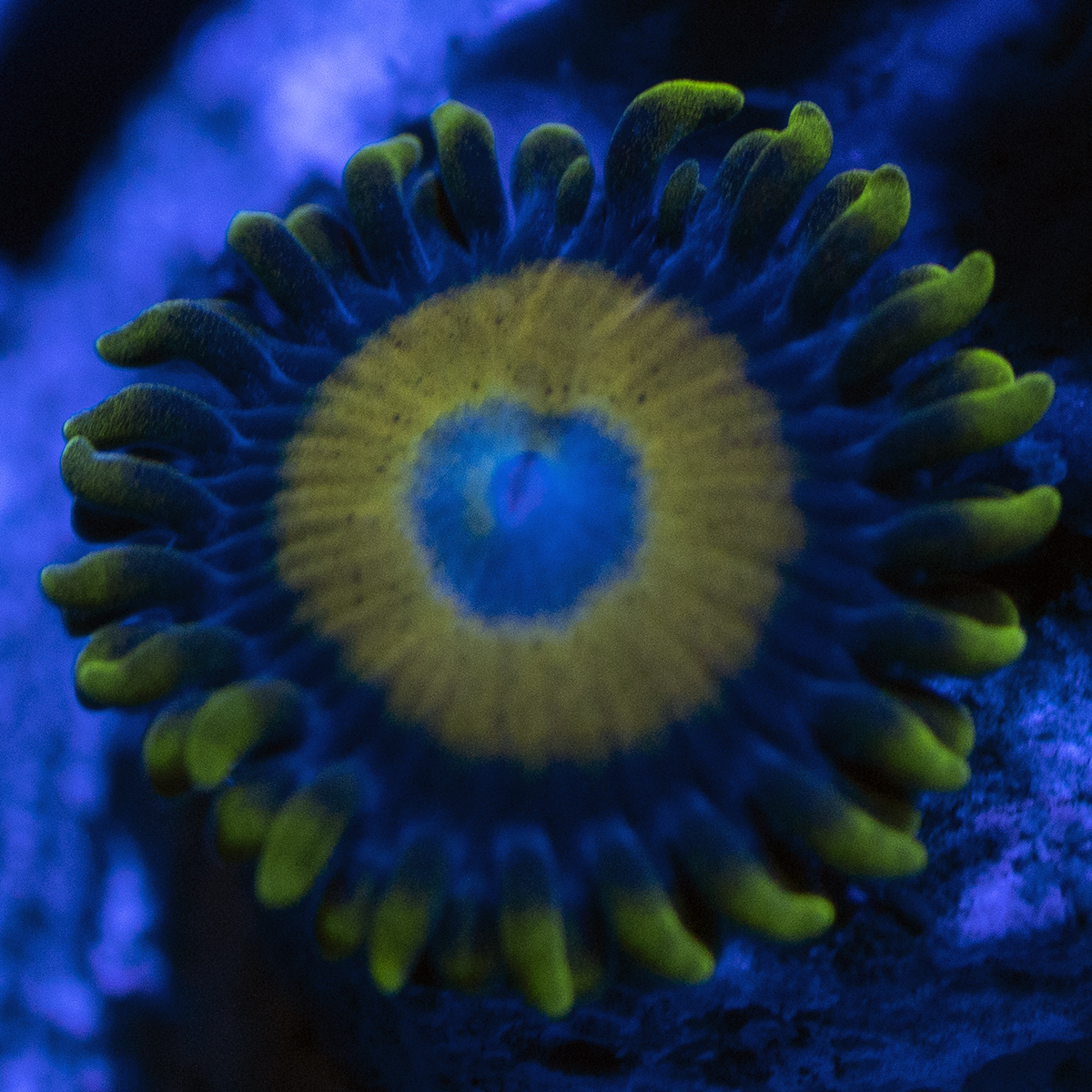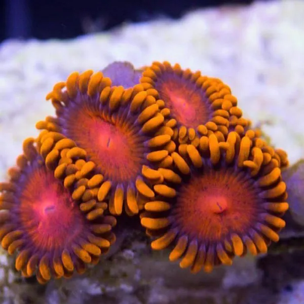 This stunning zoanthid variety features warm golden centers, creamy outer rings, and delicate skirts with hints of orange and yellow. A hardy and fast-growing coral, it thrives in moderate lighting and flow, making it a vibrant addition to any reef aquarium. Perfect for adding a touch of elegance and color to your coral collection.