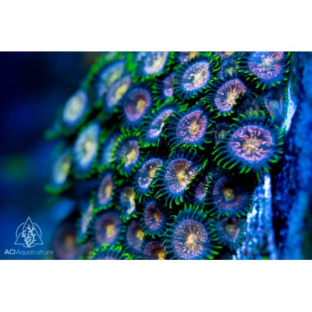 The Nirvana Zoanthid is a striking aquacultured coral featuring a vibrant mix of blues, purples, and glowing golden centers. Hardy and fast-growing, it thrives in moderate lighting and water flow, making it an eye-catching and low-maintenance addition to any reef aquarium.